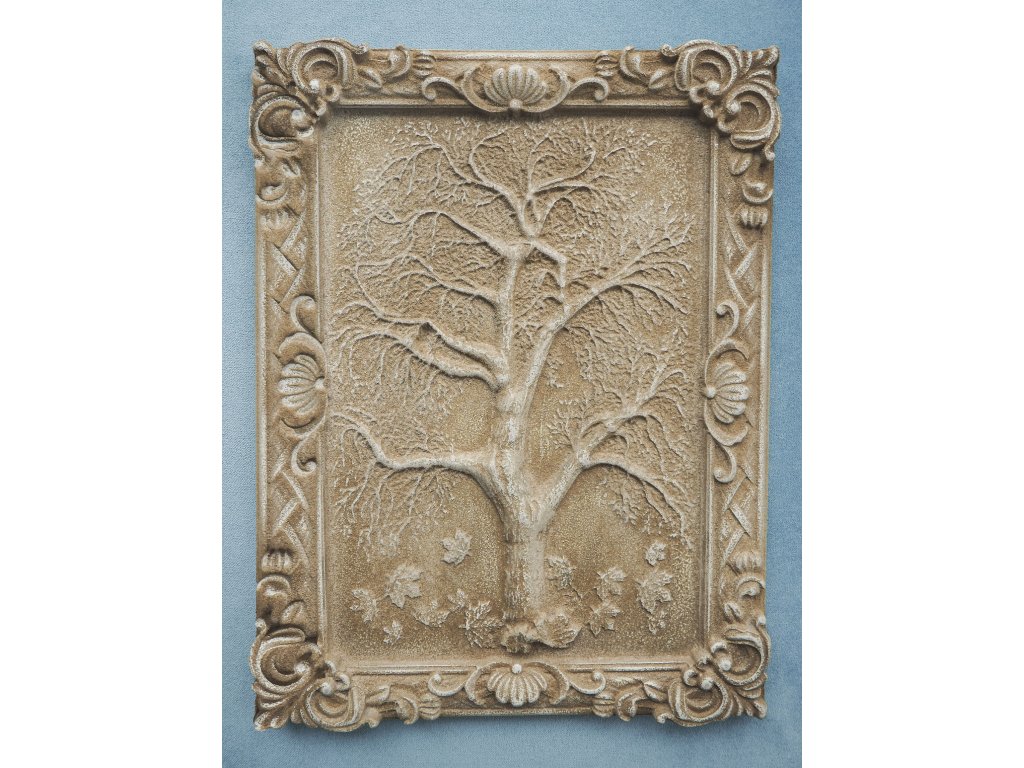 Obraz je vyrobený z MDF o hrúbke 18 mm striekanej bielou Ral farbou v kombinácii s bledohnedou patinou, zadná strana biela.